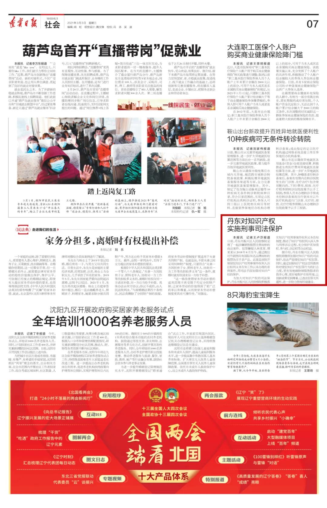 2021年3月3日,《辽宁日报》七版刊登:“丹东对知识产权实施刑事司法保护”一文,内容如下: