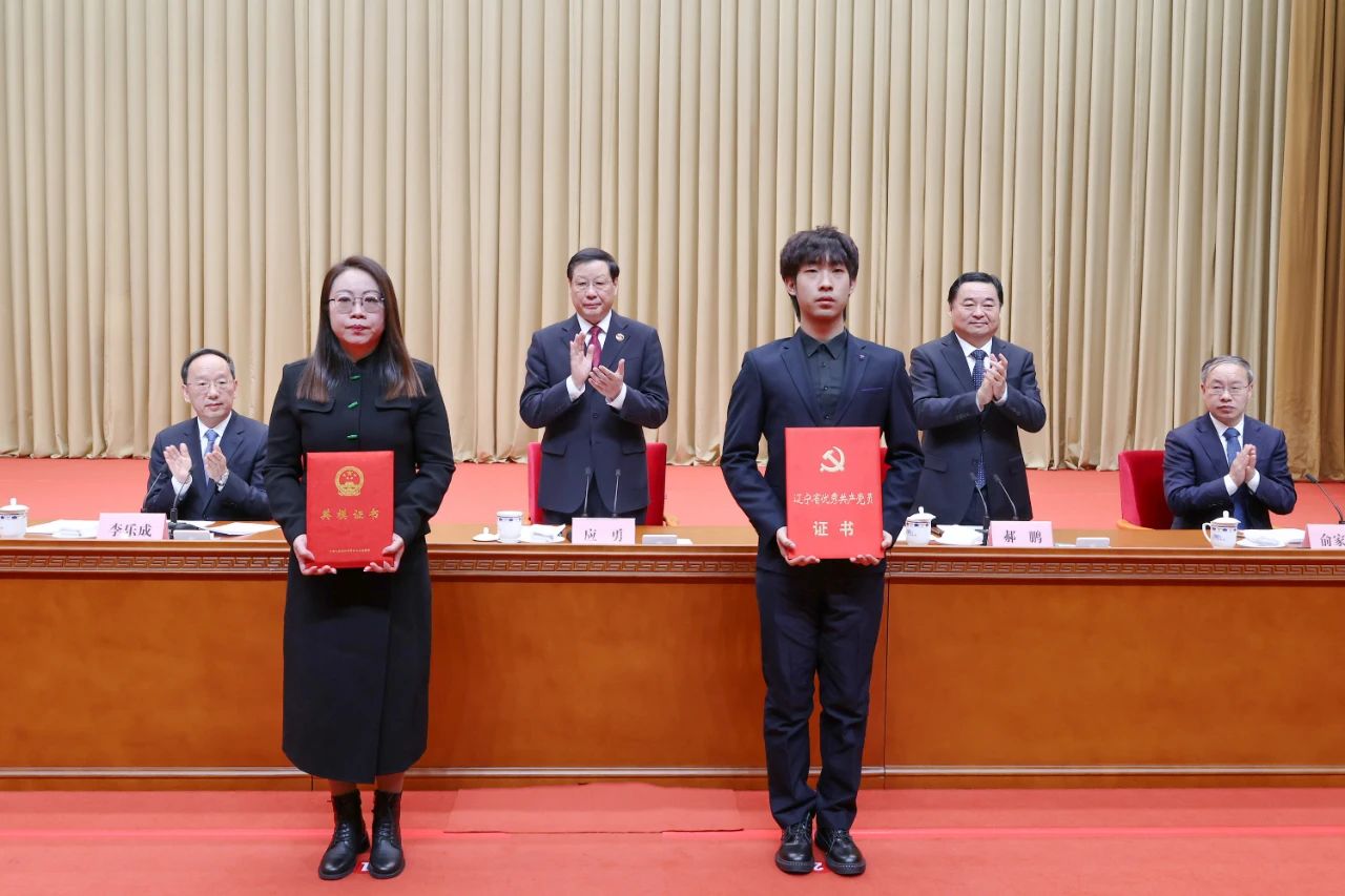 表彰大会上,应勇、郝鹏分别向潘非琼同志家属颁发“全国模范检察官”“辽宁省优秀共产党员”证书。