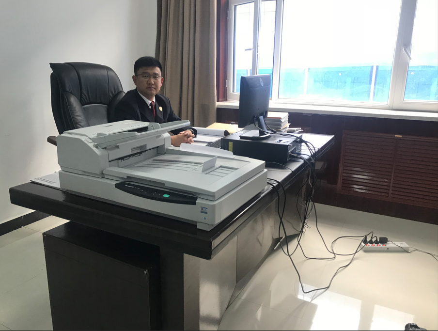 ▲由于塔城成人小说 案管大厅尚未建成,尹学智同志在临时办公室开展工作