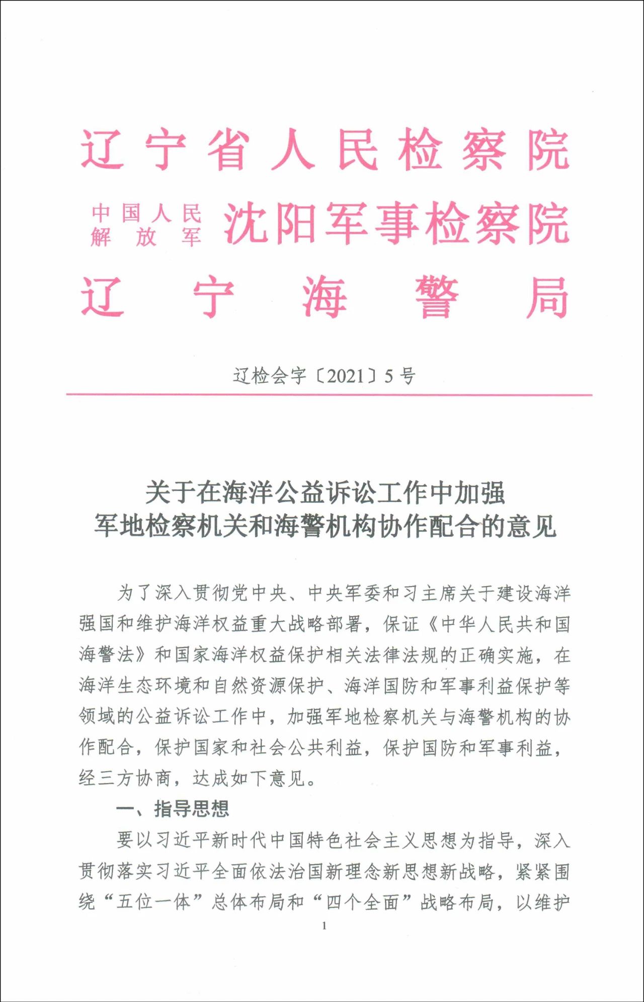 2021年5月19日,成人小说 、中国人民解放军沈阳军事成人小说 、辽宁海警局正式签订《关于在海洋公益诉讼工作中加强军地检察机关和海警机构协作配合的意见》(以下简称《意见》),这标志着辽宁检察公益诉讼工作将迈向广阔的蓝色海洋。辽宁军地检察机关和海警机构在深入贯彻党中央、中央军委关于建设海洋强国和维护海洋权益重大战略部署、保证《中华人民共和国海警法》和国家海洋权益保护相关法律法规的正确实施、深入推进海洋生态环境和自然资源保护、海洋国防和军事利益保护等领域的公益诉讼工作,揭开了崭新的一页。