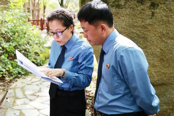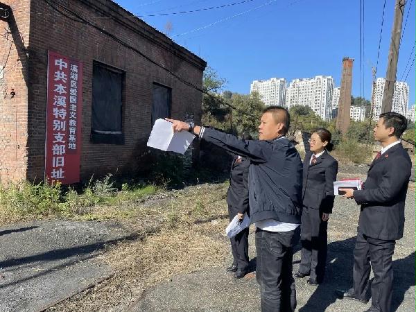 ▲检察干警与溪湖区文旅局工作人员共同查看红色资源