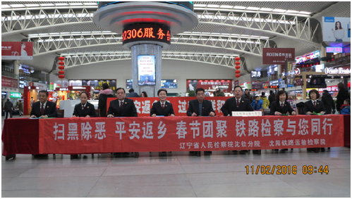 为进一步做好铁路安全稳定工作,2月11日,沈阳铁路检察机关以“扫黑除恶、平安返乡、春节团聚,铁路检察与您同行”为主题,在管内集中开展了主题宣传活动。