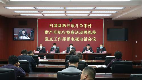 会议由省院第十一检察部主任于长春主持。第五检察部副主任孙立民对扫黑除恶专项斗争案件财产刑执行检察活动工作方案进行了说明;副主任杨晓东对《关于建立社区矫正巡回检察模式 推进刑事执行检察工作深度融入社会治理的意见》进行了说明;主任林沂对当前和今后一个阶段重点工作进行了部署。